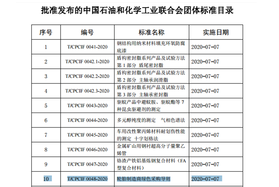 2020年4月7日,中國(guó)石油和化學(xué)工業(yè)聯(lián)合會(huì)發(fā)布了關(guān)于批準(zhǔn)發(fā)布《鋼結(jié)構(gòu)用納米材料填充環(huán)氧防腐底漆》等15項(xiàng)團(tuán)體標(biāo)準(zhǔn)的公告(2020年01號(hào))。由我司參與編制的團(tuán)體標(biāo)準(zhǔn)《輪胎制造商綠色采購(gòu)導(dǎo)則》(T/CPCIF 0048-2020)...