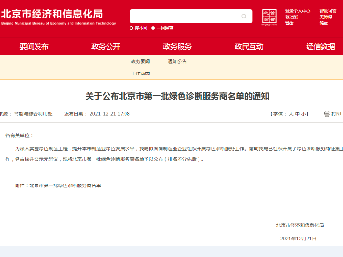 2021年12月21日,北京市經(jīng)濟(jì)和信息化局發(fā)布了《關(guān)于公布北京市第一批綠色診斷服務(wù)商名單的通知》。經(jīng)審核,我司成功入圍北京市第一批綠色診斷服務(wù)商。...
