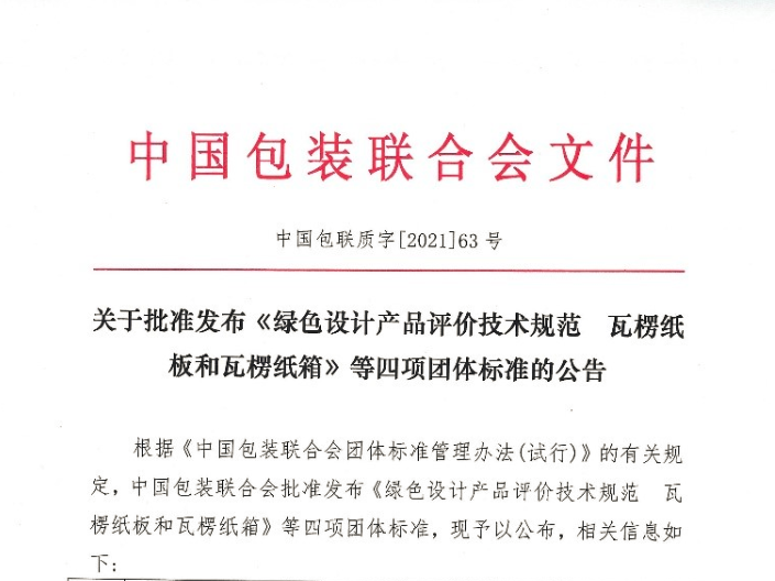 2021年12月30日,我司參與編制的《綠色設(shè)計(jì)產(chǎn)品評(píng)價(jià)技術(shù)規(guī)范 瓦楞紙板和瓦楞紙箱》(T/CPF 0022-2021)獲得中國(guó)包裝聯(lián)合會(huì)批準(zhǔn),并予以公布。