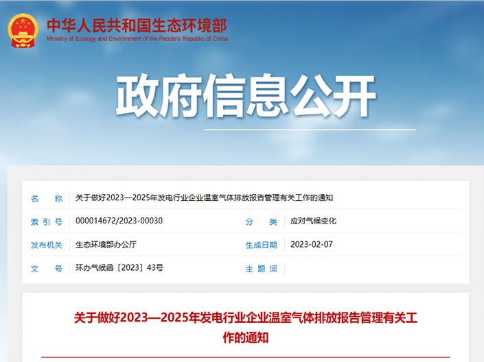 2月7日,生態(tài)環(huán)境部發(fā)布《關(guān)于做好2023—2025年發(fā)電行業(yè)企業(yè)溫室氣體排放報(bào)告管理有關(guān)工作的通知》,文件指出,各省級生態(tài)環(huán)境部門要依據(jù)《碳排放權(quán)交易管理辦法(試行)》有關(guān)規(guī)定,組織開展發(fā)電行業(yè)企業(yè)溫室氣體排...