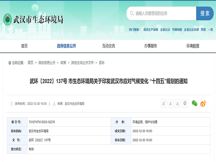 日前,武漢市生態(tài)環(huán)境局印發(fā)武漢市應對氣候變化 “十四五”規(guī)劃,規(guī)劃提出,到2025年,全市溫室氣體與污染物排放協(xié)同控制能力明顯增強,單位地區(qū)生產總值二氧化碳排放降低完成省下達目標,甲烷、氧化亞氮等非二氧化...