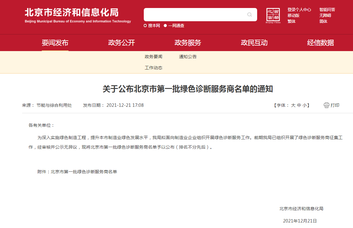 2021年12月21日,北京市經(jīng)濟(jì)和信息化局發(fā)布了《關(guān)于公布北京市第一批綠色診斷服務(wù)商名單的通知》。經(jīng)審核,我司成功入圍北京市第一批綠色診斷服務(wù)商。