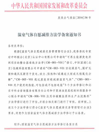 《溫室氣體自愿減排方法學(xué)備案通知書》(發(fā)改辦氣候備[2016]36 號(hào)):
