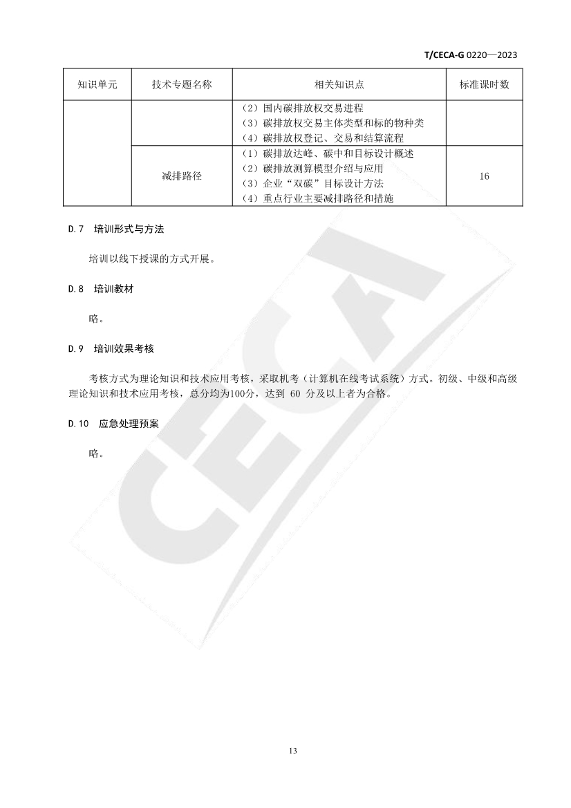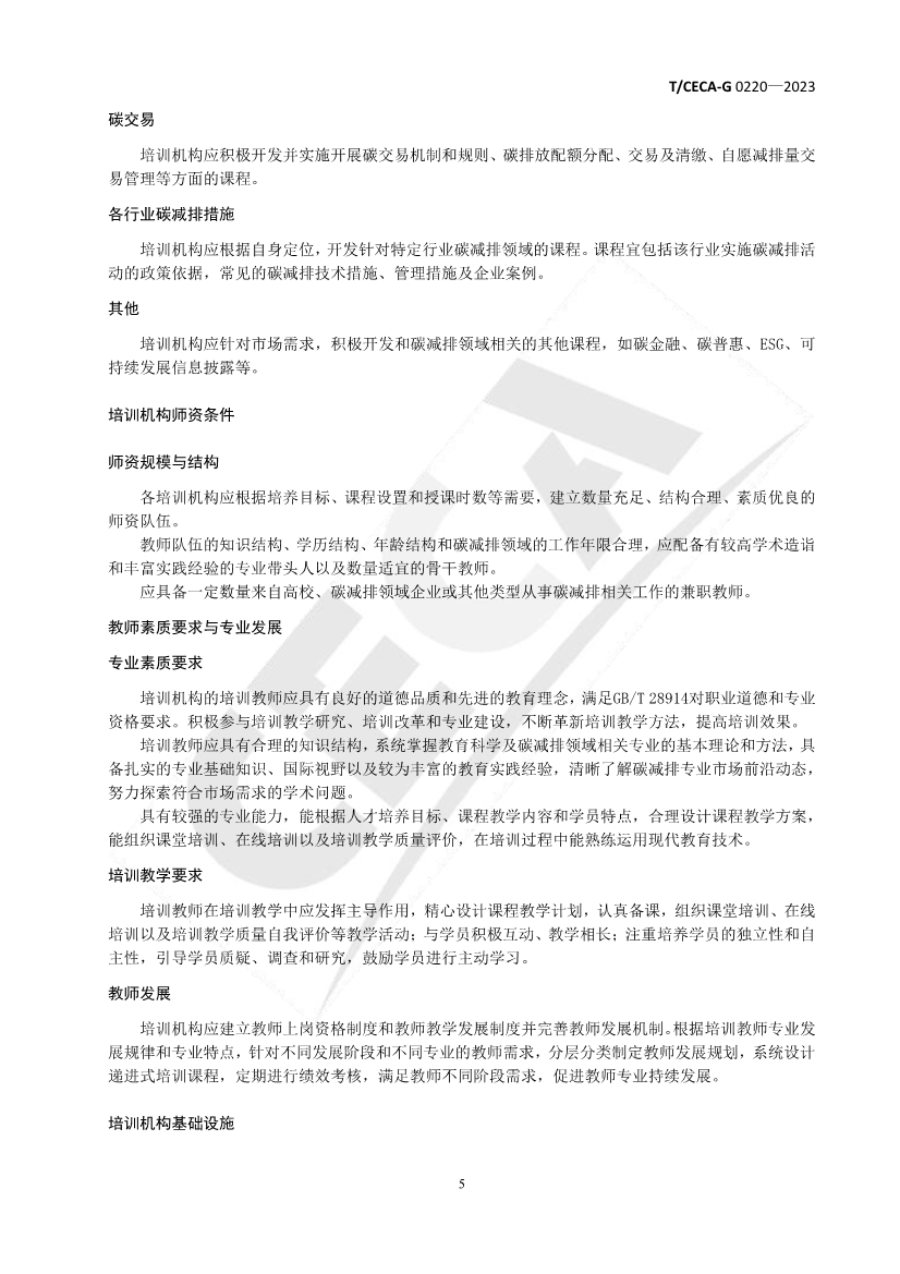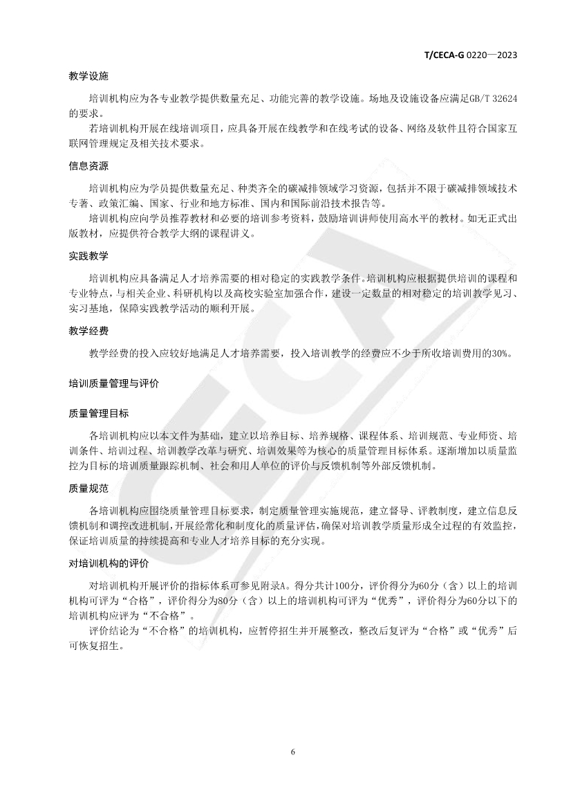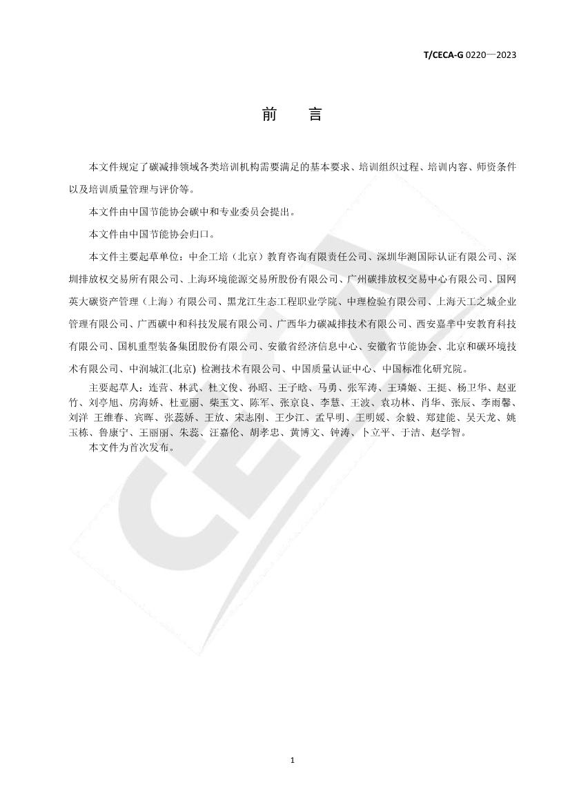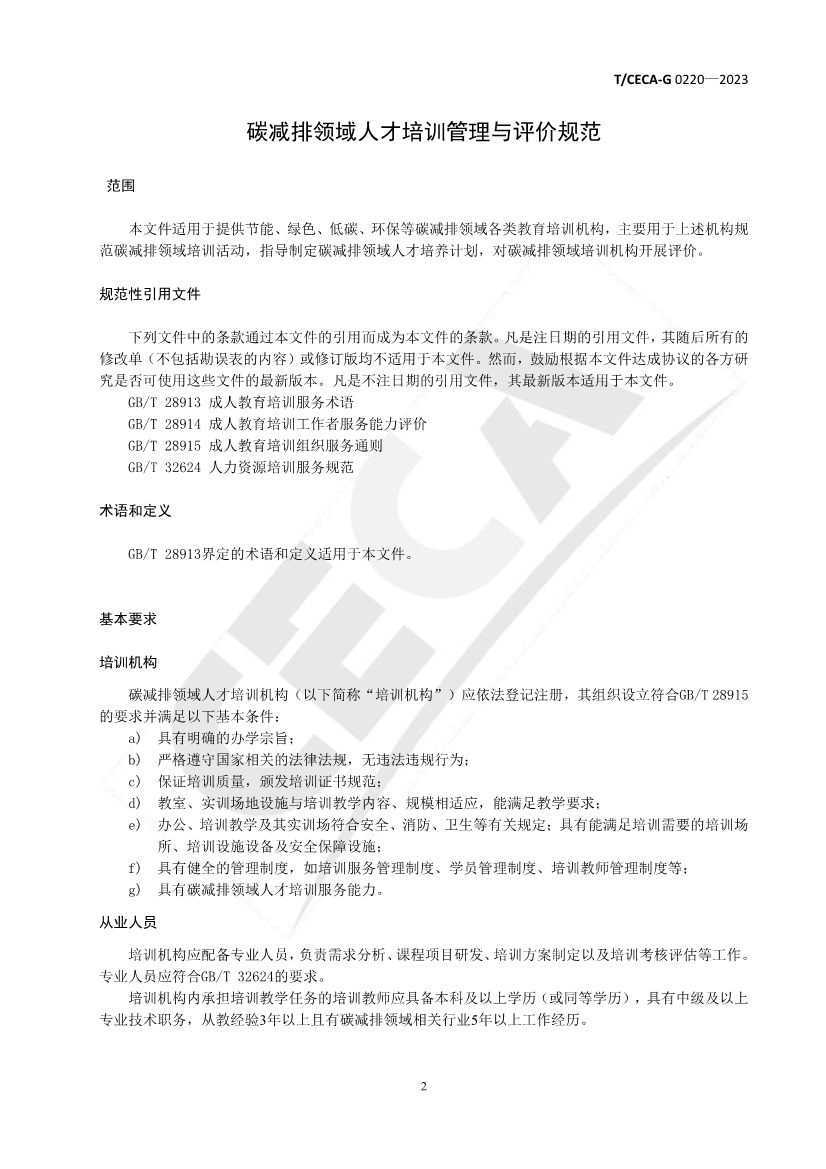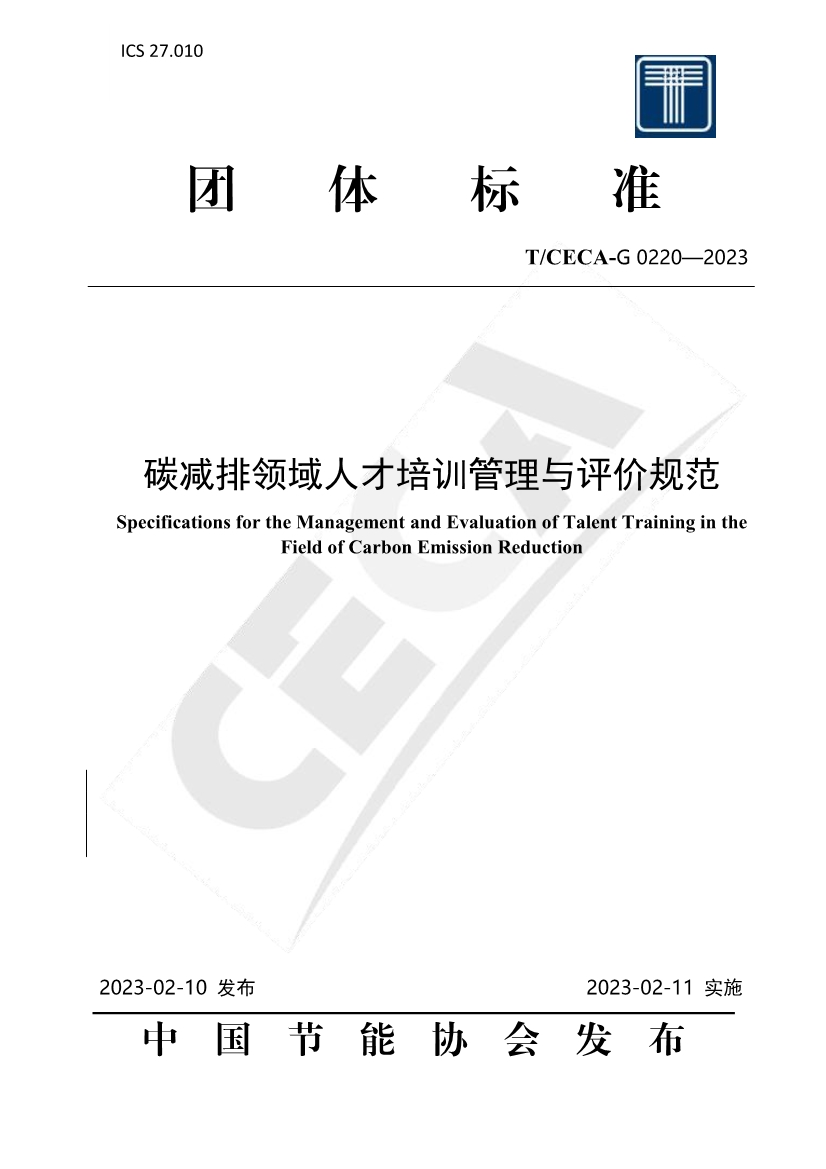 2023年2月10日,由中國節(jié)能協(xié)會碳中和專業(yè)委員會提出,中企工培(北京)教育咨詢有限責(zé)任公司、深圳華測認(rèn)證國際認(rèn)證有限公司等單位共同編制的《碳減排領(lǐng)域人才培訓(xùn)管理與評價規(guī)范》(T/CECA-G 0220—2023)團(tuán)體標(biāo)準(zhǔn)由中國節(jié)能協(xié)會正式發(fā)布,于2023年2月12日正式實施。